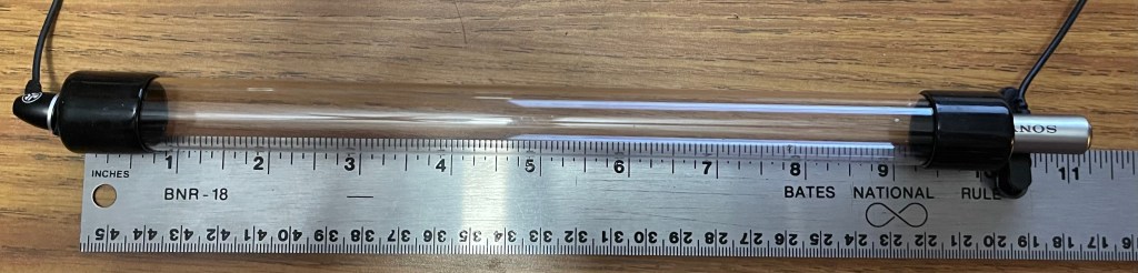 Using the audacity data provided, you can download and analyze the acoustic interferometry data to determine the resonance mode frequencies. Making a plot of resonance mode (N) versus the resonant frequency should produce a linear area of points that can be fit. The slope is related to the length of the tube and the speed of sound of air (roughly 343 m/s). Hence, determine the exact length of the tube used for the measurement (you can see from the picture above that the approximate length is 10 inches).