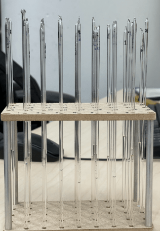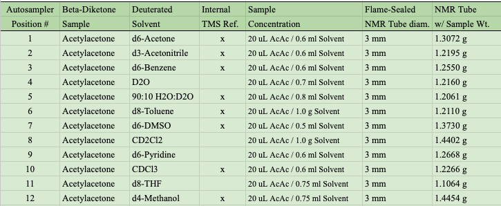 NMR samples were made using an OpenTron (OT2) liquid handler by adding 20 microliters of AcAc into a deuterated NMR solvent (typically 0.6 mL). The NMR solvent often contains 0.03% v/v tetramethylsilane (TMS), which is using as an internal reference. These solutions were pipetted into a 3 mm NMR tube and flame sealed. A rack of flame sealed NMR samples are shown below, along with the bottle of AcAc and 20 microliters in one of the OT2 pipette tips.