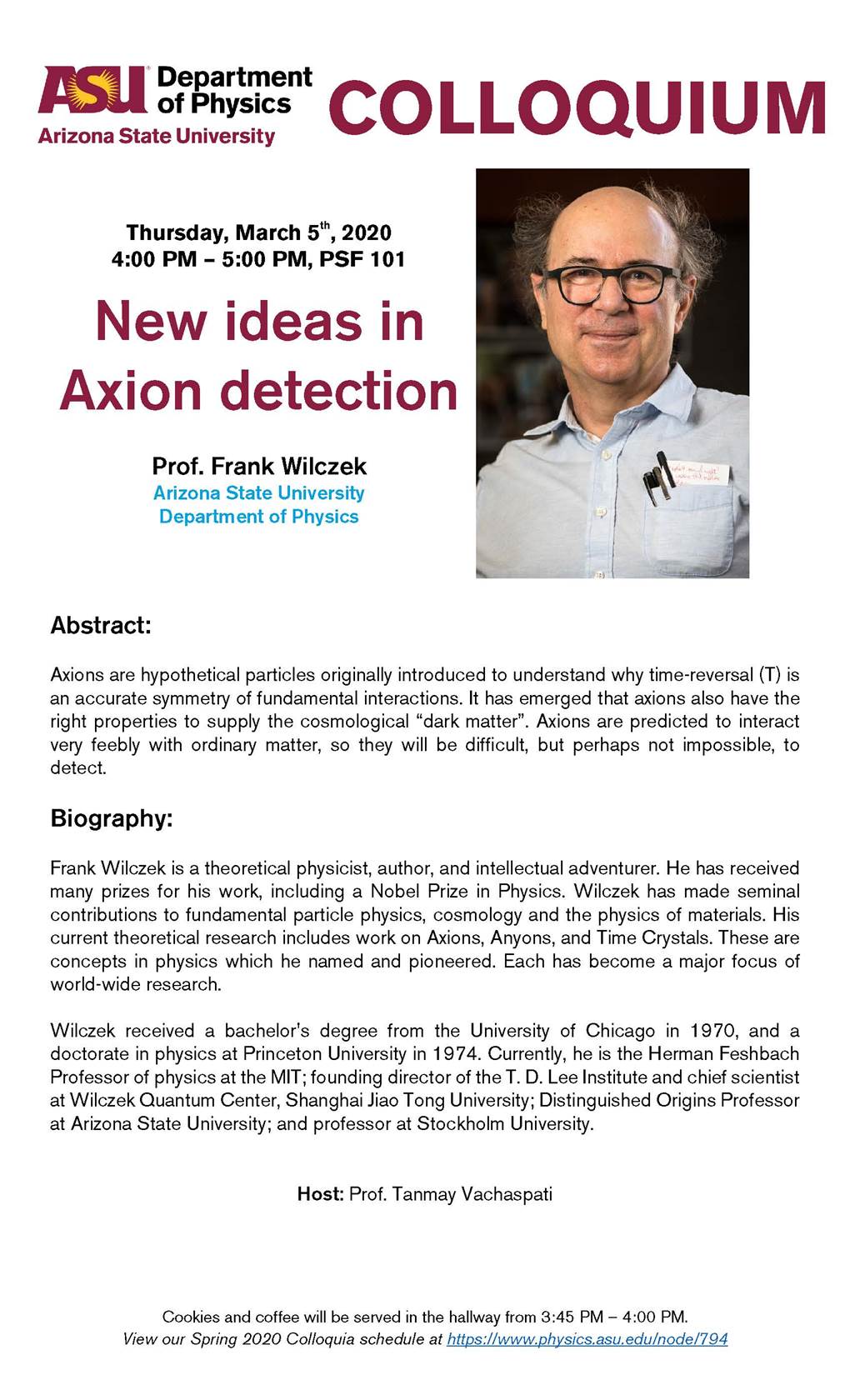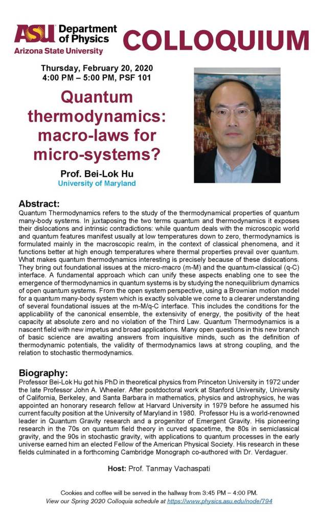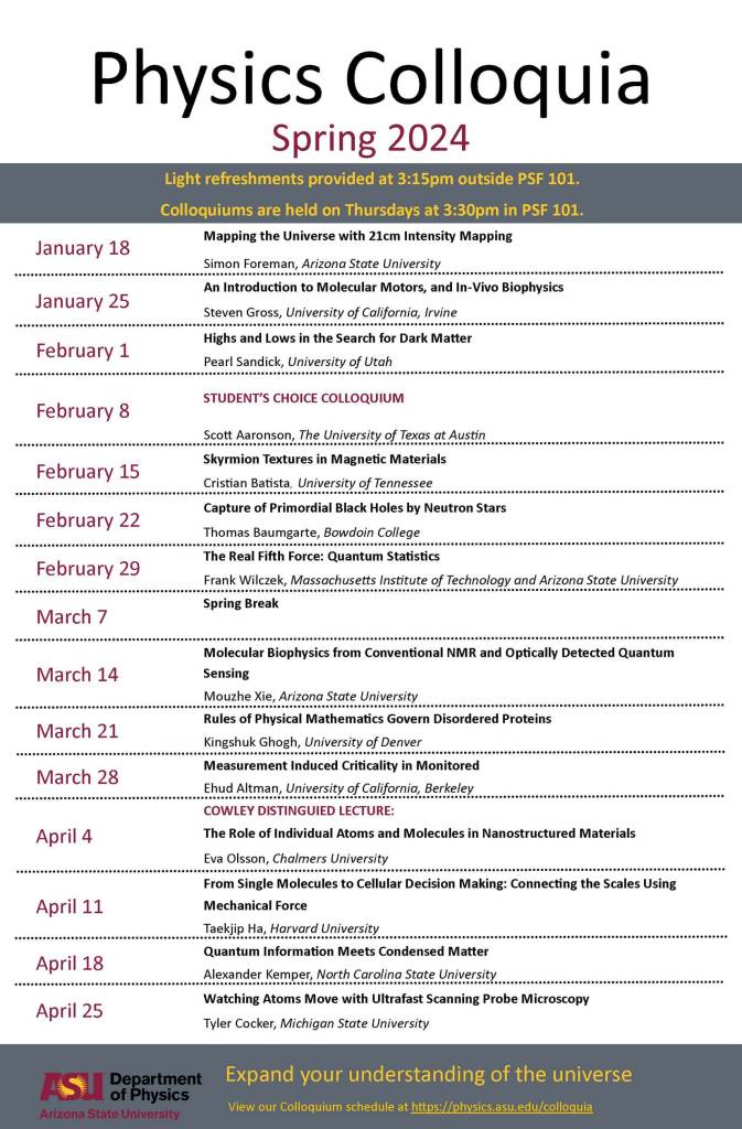 The Department of Physics at ASU hosts colloquia every semester. Each semester speakers from around the world from various physics topics are asked to give a talk on relevant and innovative research. Colloquia are held on Thursdays. Light refreshments will be served at 3:15pm outside PSF 101, and Colloquium lecture will begin at 3:30pm in PSF 101.