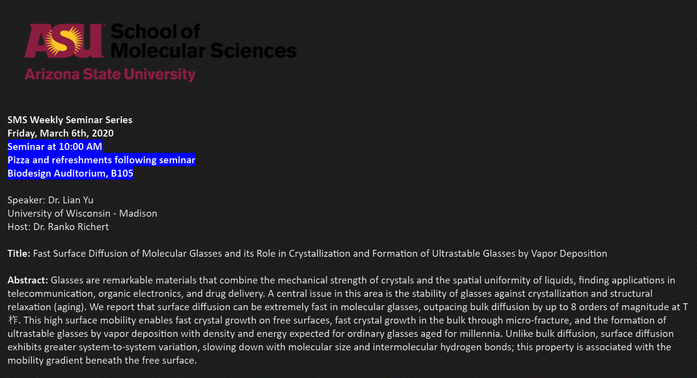 SMS Seminars will be on Fridays @ 3:00 pm in Biodesign Auditorium. If you have any questions regarding SMS seminars please contact: SMSSeminars@asu.edu