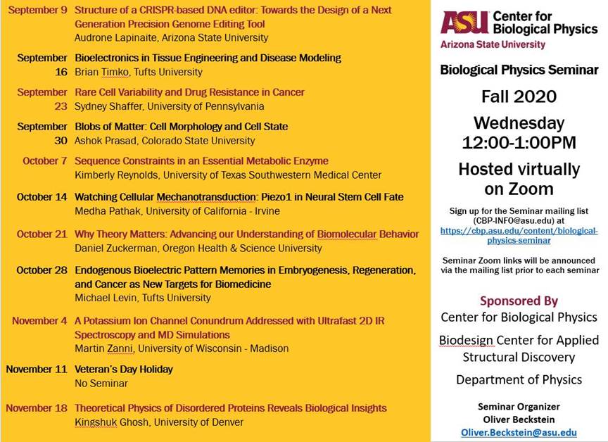- Aug 27, Prof. Steve Presse (SMS and Physics at ASU).